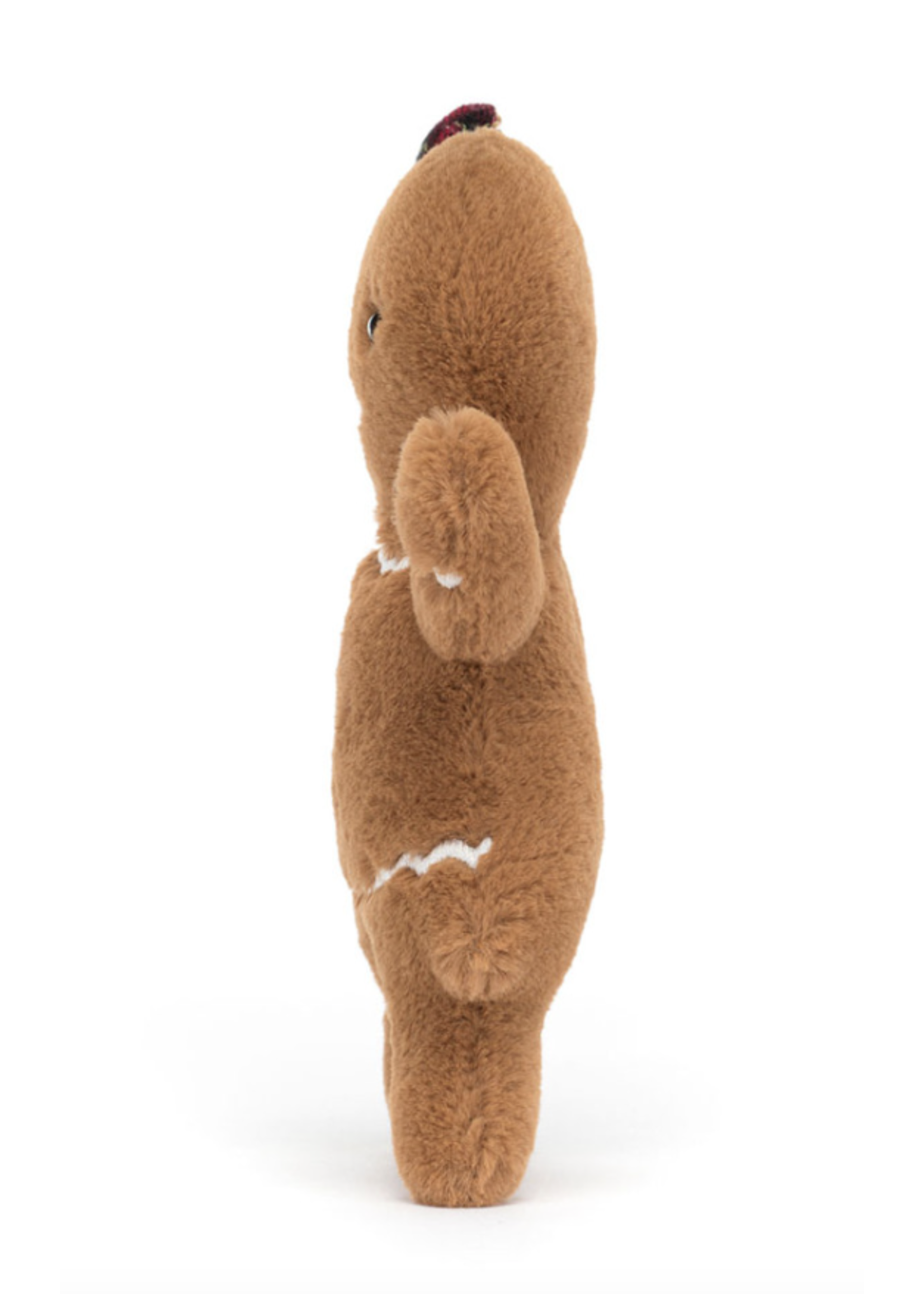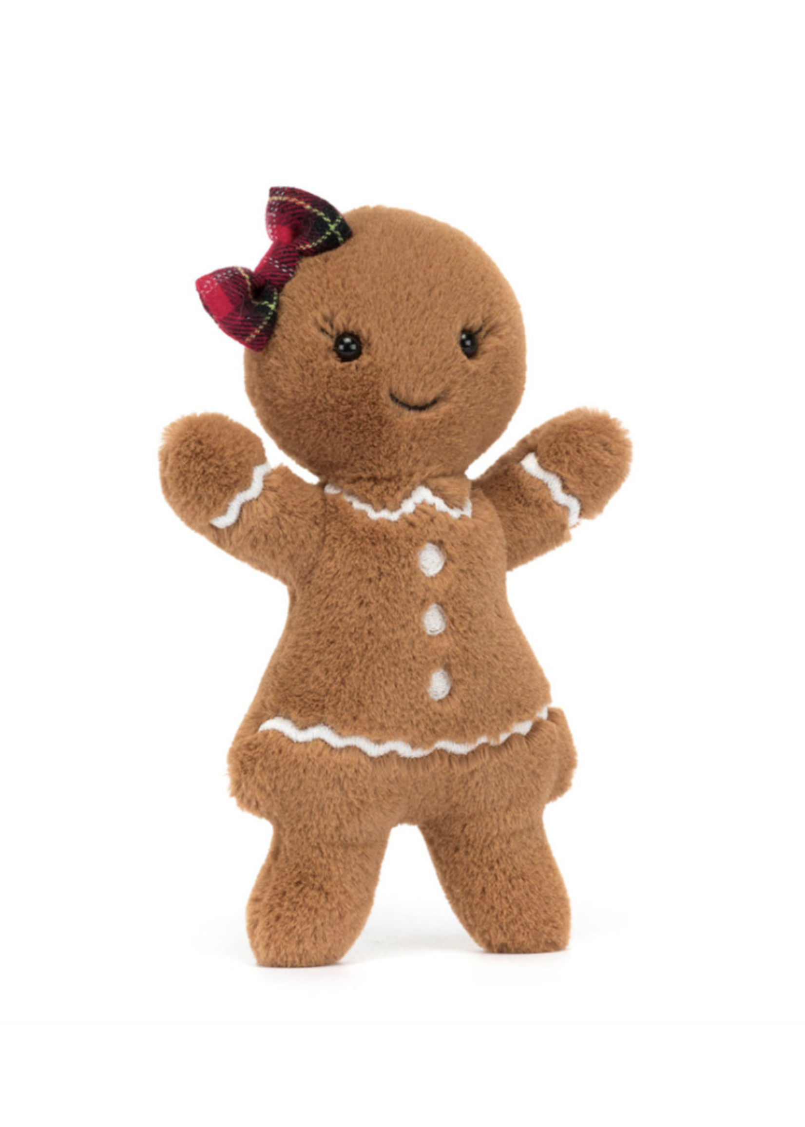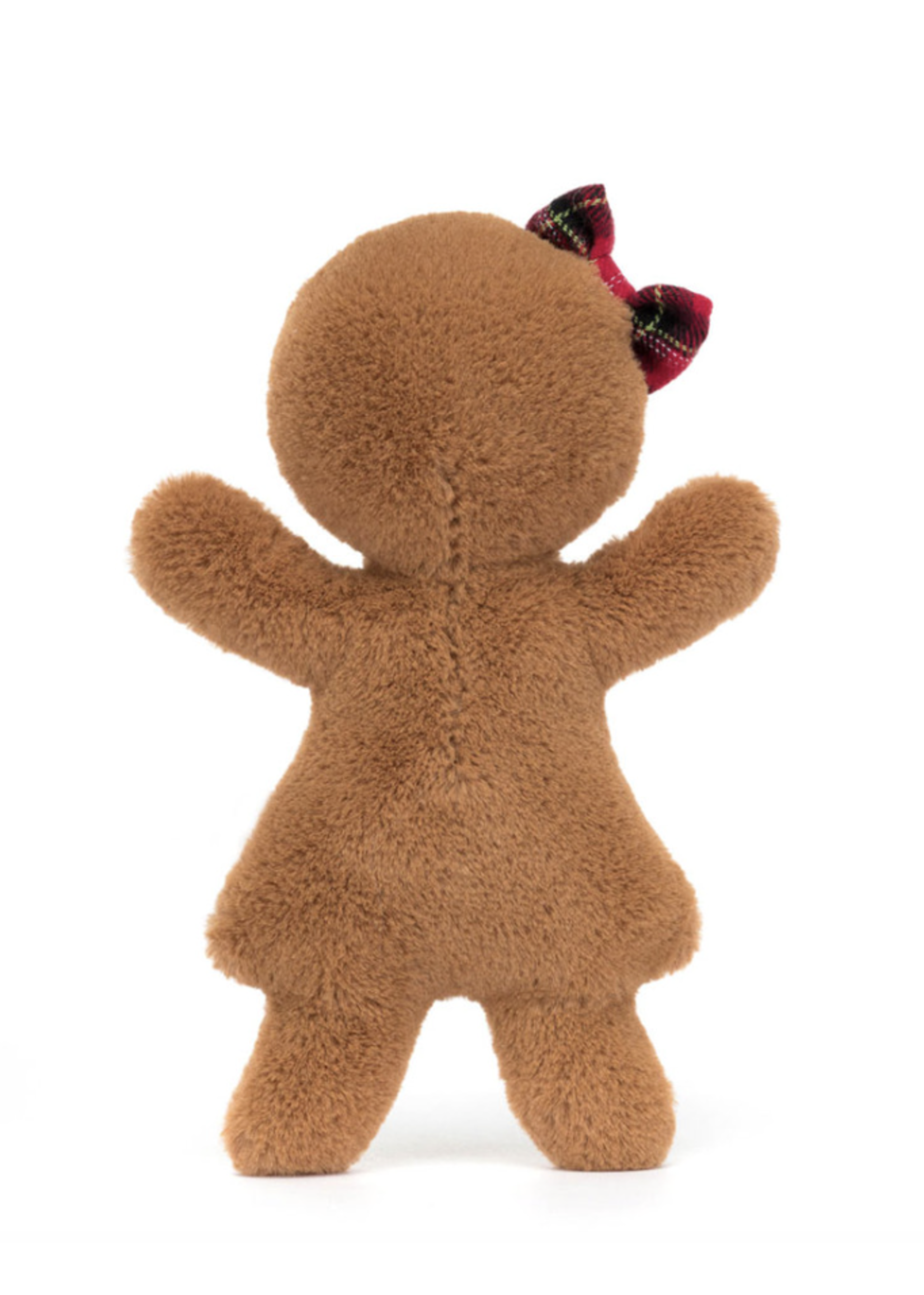 Jolly Gingerbread Ruby can't wait for Christmas! She's all glammed up in a stitched icing dress and her cosy fur is baked to perfection. With embroidered lashes and a tartan hair bow, and biscuit arms aloft, Ruby shines!